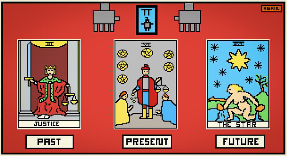 Working with programmer and DMG co-founder Cecily Carver, who is polishing up the programming, Stone will be presenting Techno Tarot at Bento Miso’s “zine-fair-meets-arcade,” Bit Bazaar in December.