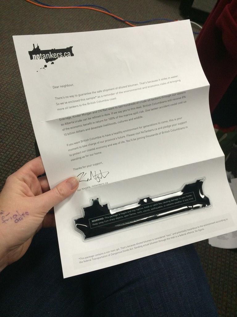 “There’s no way to guarantee the safe shipment of diluted bitumen,” it says. “That’s because it sinks in water. So we’ve enclosed this sample as a reminder of the environmental and economic risks of bringing more oil tankers to the British Columbia coast.”