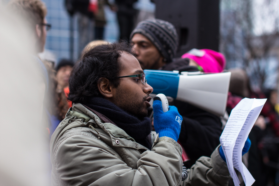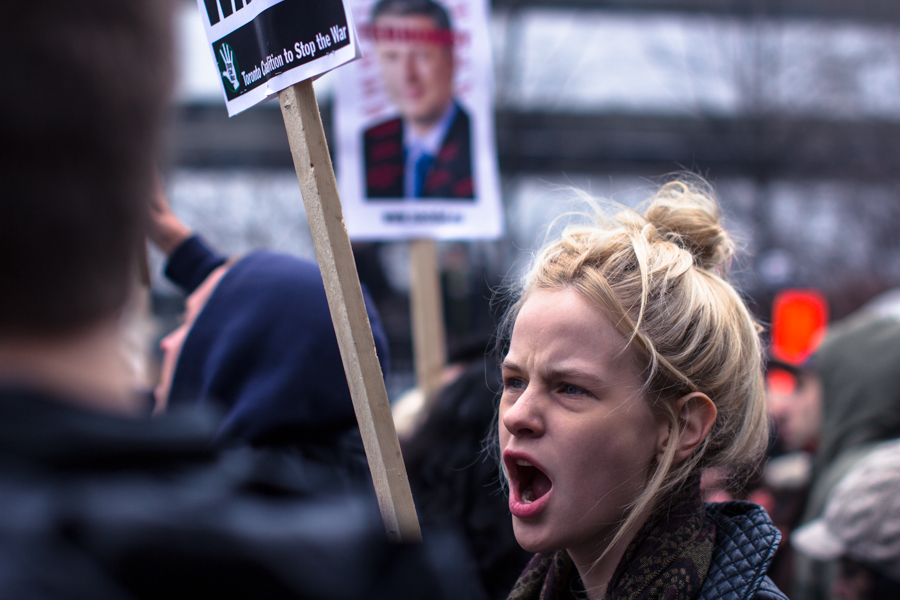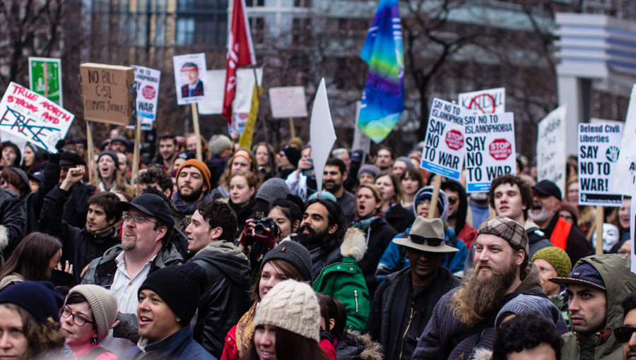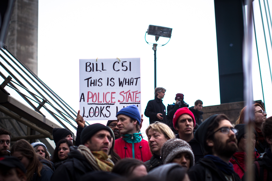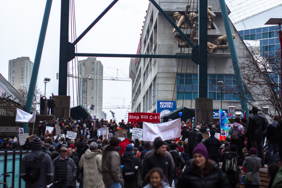 On Saturday, March 14th protestors flooded the streets of downtown Toronto in opposition to the Conservative Party’s “anti terror” Bill C-51. Protestors gathered at Queen and University, about 500 strong, before preceding into the entertainment district and gathering ahead of the bridge at the foot of the CN tower.