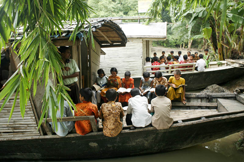 Shidhulai has transformed boats into schools, taking these flooded areas and providing the community with the opportunity to rebuild itself. There are a total of 111 schools, libraries, healthcare and training centres built on boats.