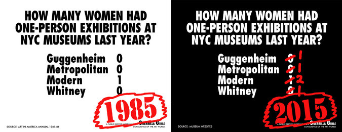 An anniversary recount sticker showing numbers from 1985 and 2015. Credit: Guerrilla Girls