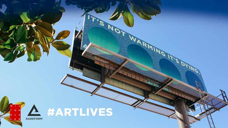 For the first installment of #ArtLives, RAREFORM and Lamar recruited world-renowned graphic artist Milton Glaser, known for the iconic “I heart NY” logo and Mad Men ads. Lamar installed Glaser’s “It’s Not Warming, It’s Dying” campaign to kick off the series. The billboard will be on display until the end of October, when it will be taken down and repurposed into 300 limited edition backpacks and accessories.
