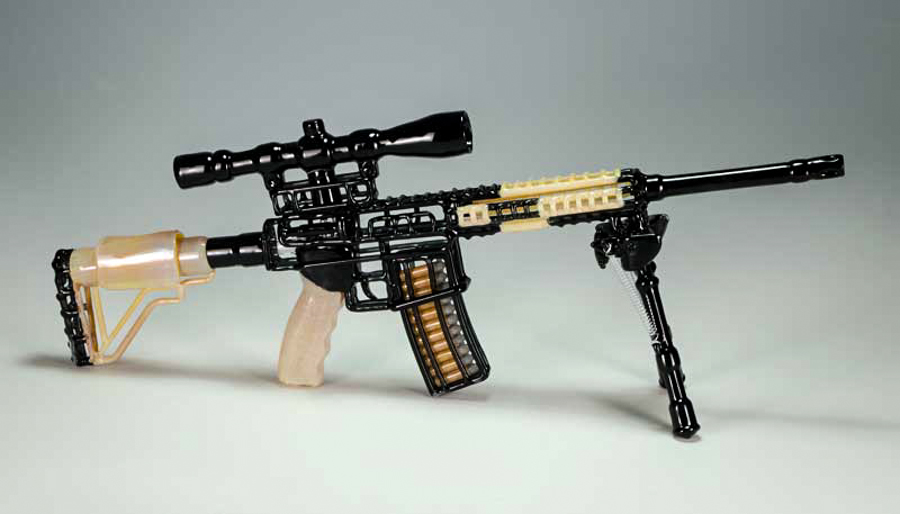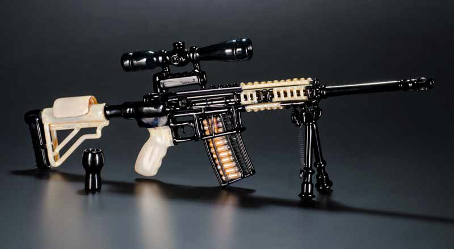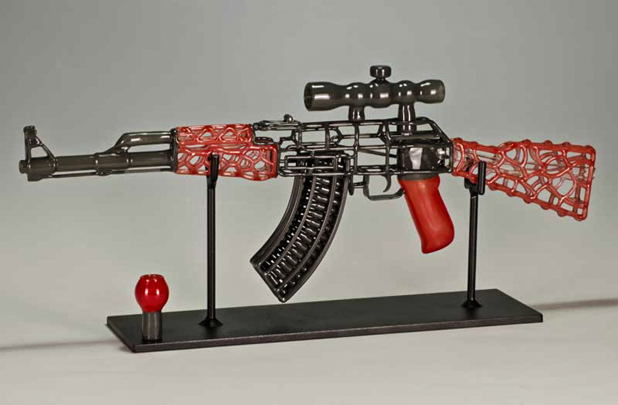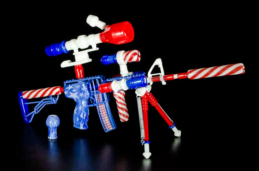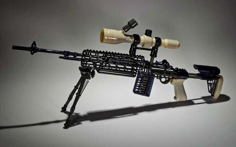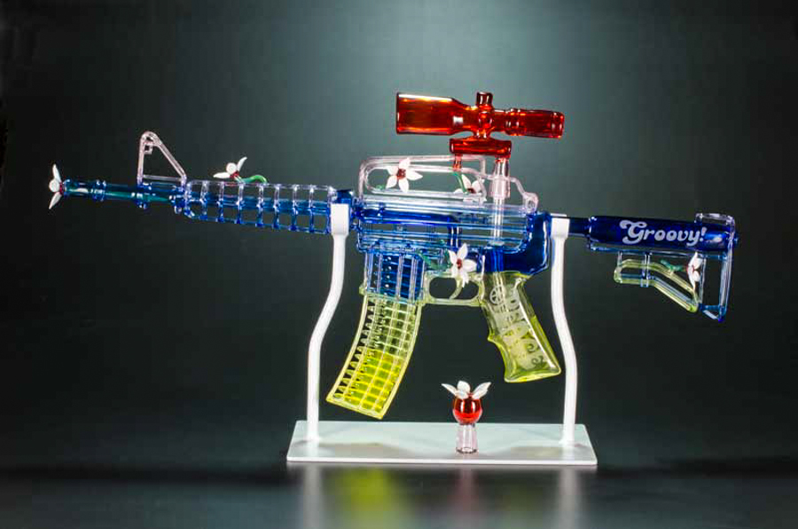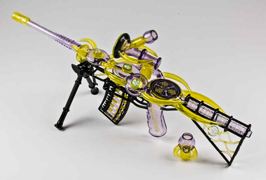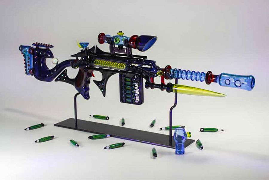 His blown-glass gun replicas are as beautiful as they are functional. Despite being near exact glass-replicas of real guns, his sculptures also work as pipes. Although Mickelsen has never been a fan of guns, he began blowing glass replicas in order to satisfy his financial needs. However, after he began looking into the designs, even he had to admit that, architecturally, guns are beautiful machines. Mickelsen has found himself captivated by the contrast of a gun’s aesthetic and function.