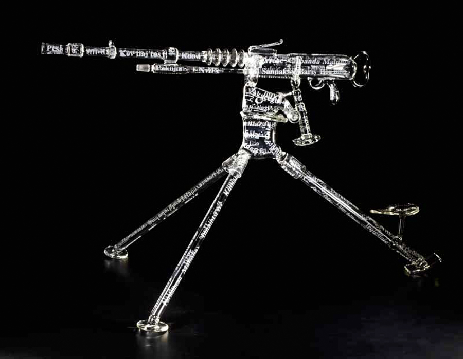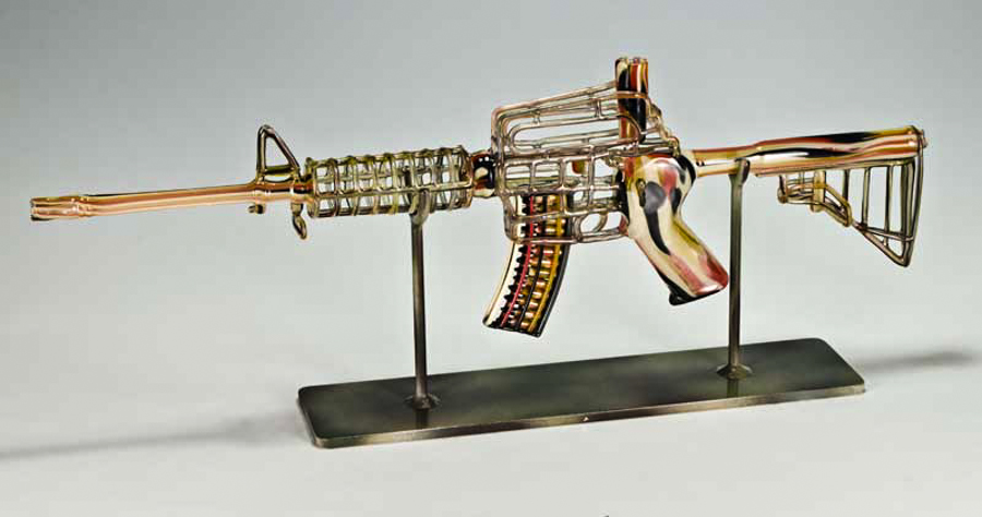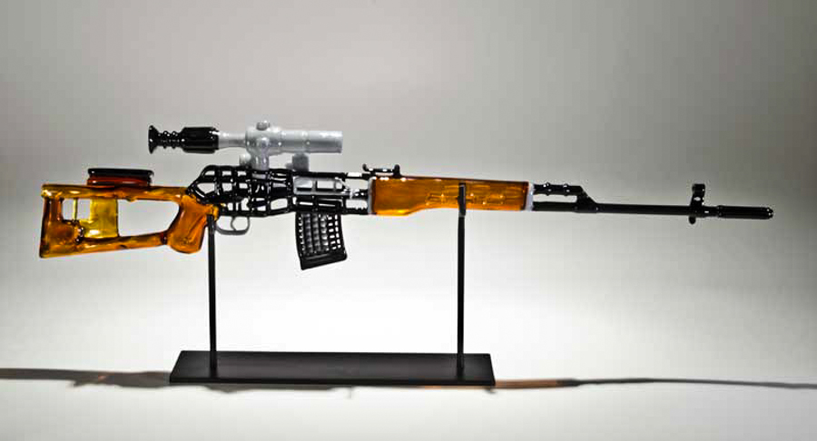 Mickelsen comments on his website, “My way of responding to that is to recreate them in glass in a function that’s not for death and destruction, that’s actually for peace. So they become weapons of peace.”