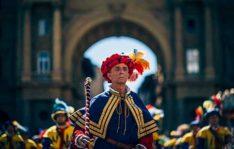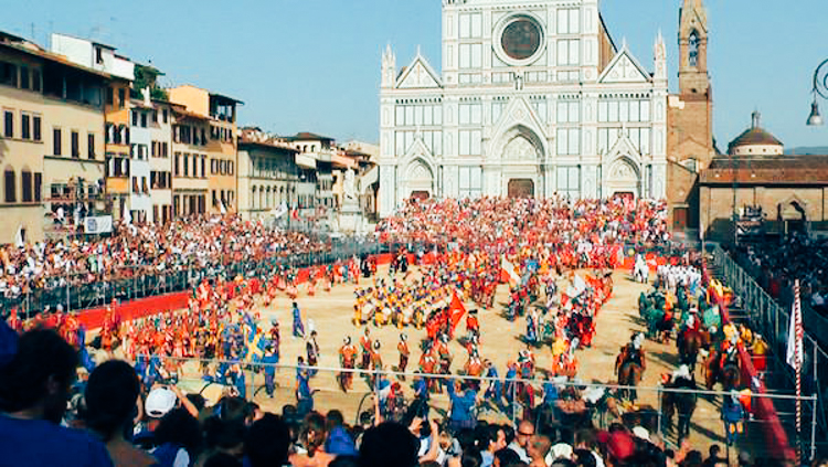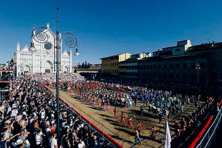 Four teams compete in an annual tournament where the four districts of Florence compete for victory. Santa Maria Novella in red, Santa Croce in blue, San Giovanni in green and Santo Spirito in white.